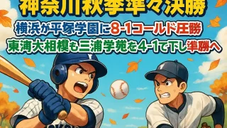 2025年高校野球秋季大会 保土ケ谷に秋の風! 神奈川秋季準々決勝 横浜が平塚学園に8-1コールド圧勝 織田の奪三振ショーでセンバツへ前進 東海大相模も三浦学苑を4-1で下し準決勝へ サーティーフォー保土ケ谷球場発(特派員)神奈川県高校野球秋季大会は28日、準々決勝2試合がサーティーフォー保土ケ谷球場で行われ、横浜が平塚学園を8-1で7回コールド勝ち、東海大相模が三浦学苑を4-1で破った。横浜は夏の死闘を再現した対戦で、... 2025.09.28 2025年高校野球秋季大会その他
